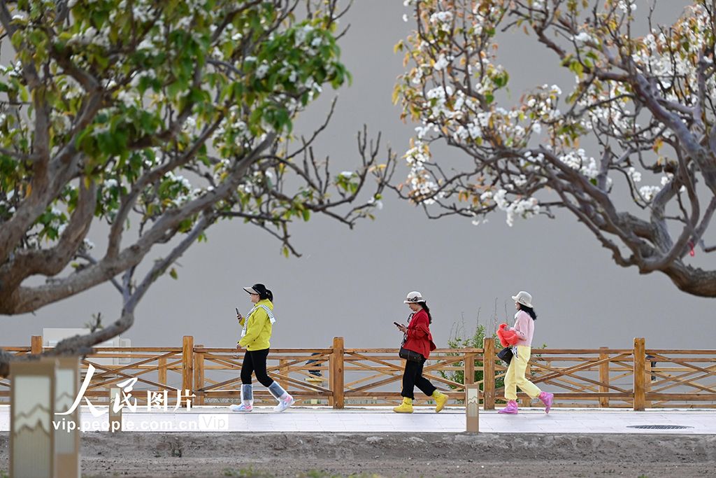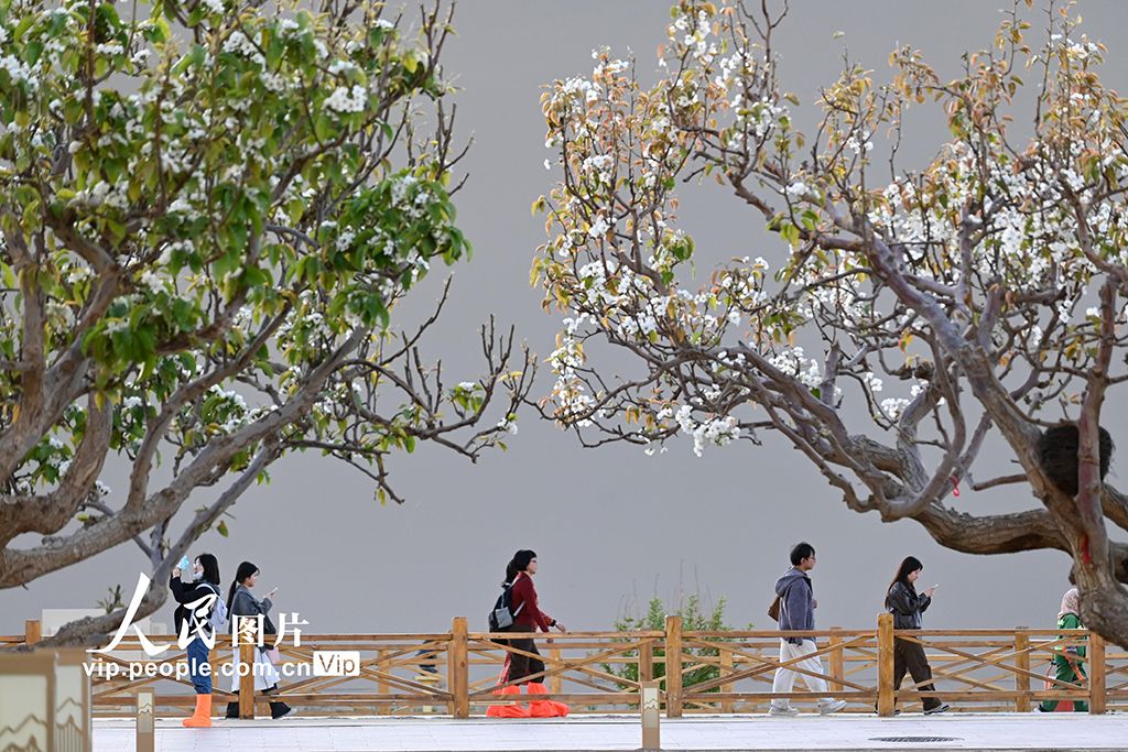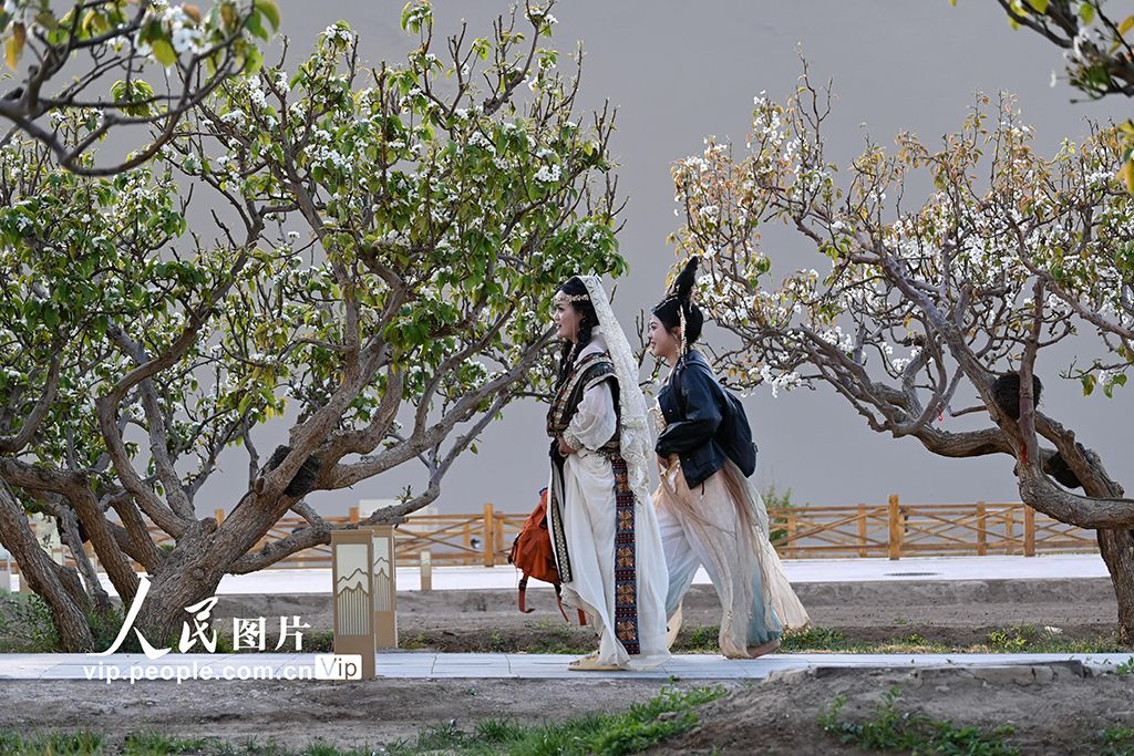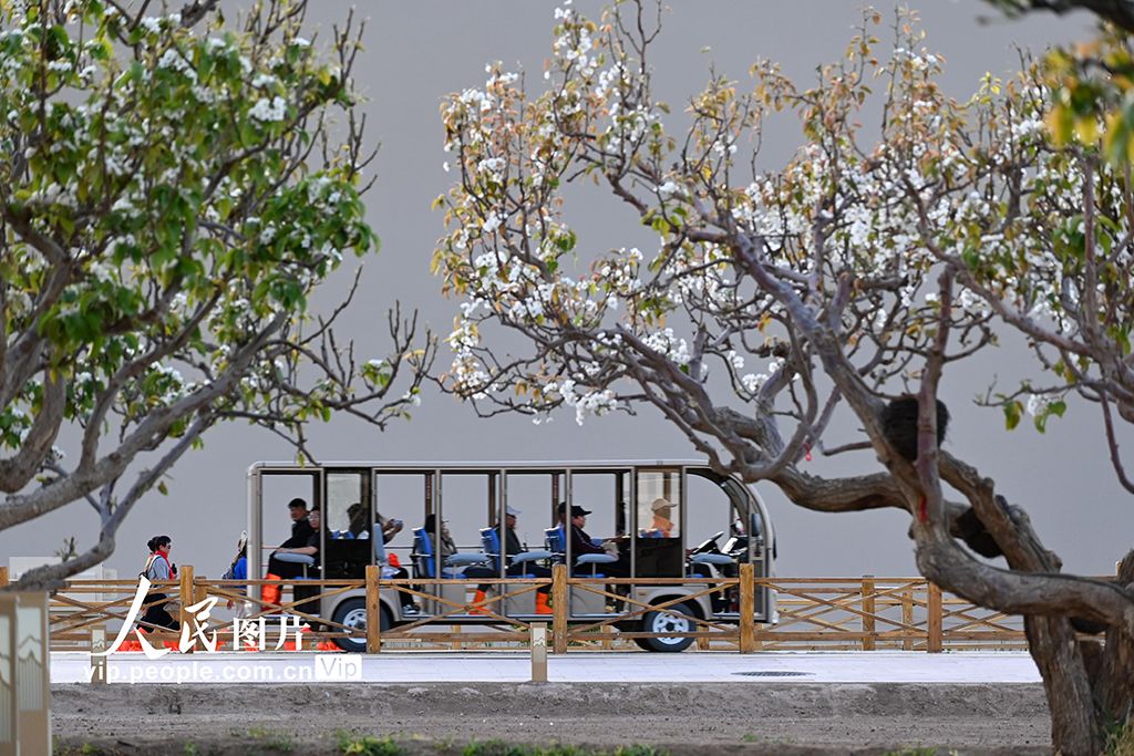 四月中旬,甘肅敦煌鳴沙山下繁花似錦,游客暢游大漠,盡享明媚春光。王斌銀攝(人民圖片網(wǎng))