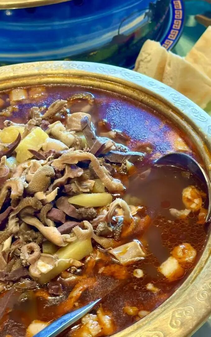 將羊肚、羊腸、羊心等“羊下水”經(jīng)多道工序精細(xì)處理,以清水旺火煮沸,撇凈浮沫后轉(zhuǎn)文火慢熬,只配以草原粗鹽、姜塊、花椒與干辣椒??此瀑|(zhì)樸的烹法,卻讓羊雜脆嫩彈牙,毫無腥膻,只留羊肉最本真的鮮美。